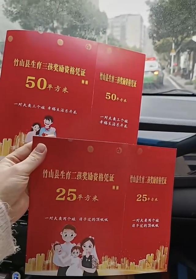 已有当地多名网友在社交平台发布视频和“红本本”,称享受到了政策福利。其中,2024年4月,一位当地居民在社交平台晒出的“竹山县生育三孩奖励资格凭证”上写有“50平方米”字样,在凭证内的政策须知中提到,该政策享受对象要求夫妻一方属于竹山户籍,该子女户籍登记在竹山县。2021年6月1日至2026年6月1日期间生育的二孩及以上的家庭,在竹山县城、宝丰镇指定区域楼盘购买商品住房,凭新生儿落户竹山证明,生育二孩家庭每户享受25平方米奖补,生育三孩家庭每户享受50平方米奖补,可叠加计算享受最高75平方米奖补。